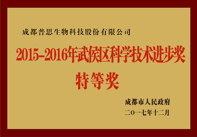 2017年 普思的科技項目“高附加值中藥成分分離純化技術研究及產業化”榮獲武侯區2015-2016年度科技進步特等獎;